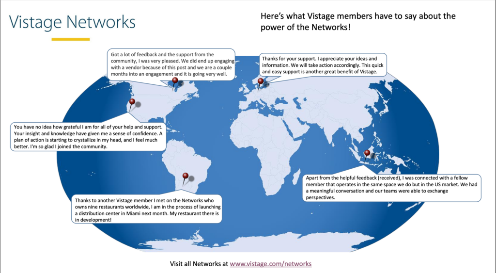 To all of our Vistage Members, get on the networks if you haven’t done so yet and download the app on your phones which you can access through My Vistage. Feel free to reach out for any assistance to access the tools.