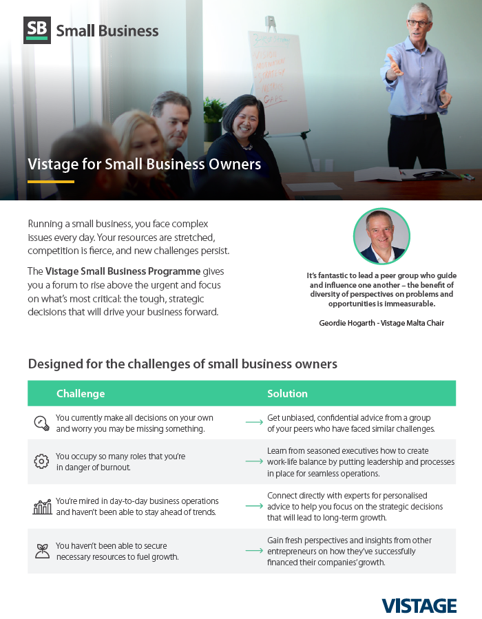 The Vistage Small Business Programme gives you a forum to rise above the urgent and focus on what’s most critical: the tough, strategic decisions that will drive your business forward and grow it faster.